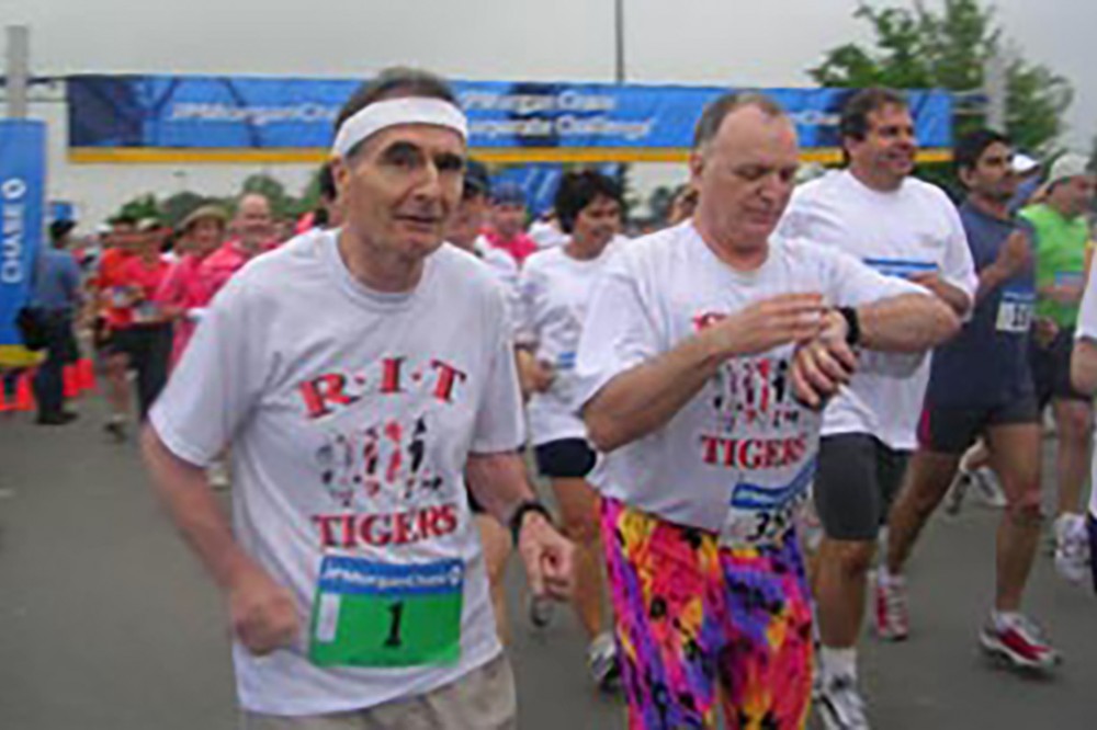 RIT President Albert Simone (left) begins the Chase Corporate Challenge in the company of RIT team captain Peter Haggerty. Simone finished the 3.5-mile course in 34 minutes. More than 9,400 runners and walkers participated in the June 1 race, which took place on the RIT campus for the third consecutive year. RIT fielded a team of 158.