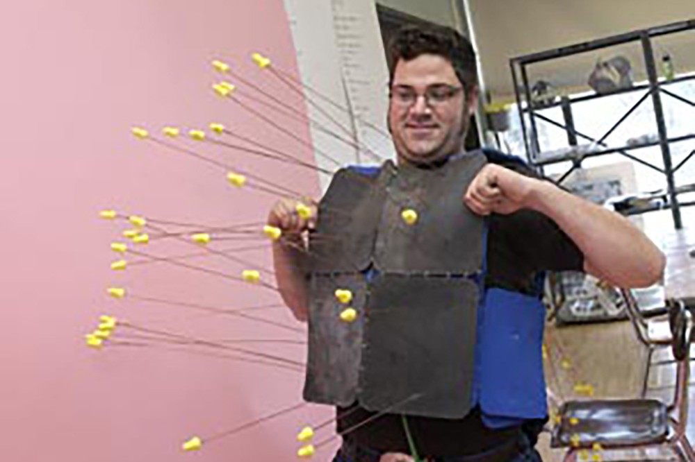 Tim Gottschall, third-year fine arts studio major designed a âvest for personal spaceâ for the annual show, 3D Extravaganza. This yearâs theme, Safe: Design over Fear, was modeled after a recent exhibit at the Museum of Modern Art. Students were required to design and construct a portable costume addressing a personal fear. Gottschallâs vest, designed to keep people from invading his personal space, was made out of mouse pads, ear plugs and wire. More than 150 students in the College of Imaging Arts and Sciences participated in the sixth annual event. -