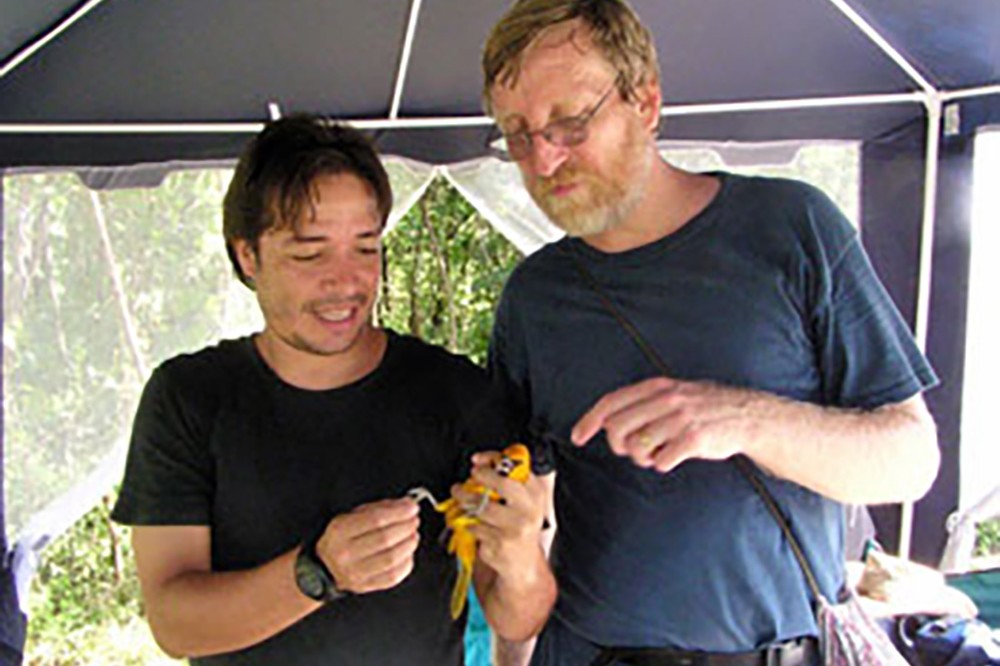 Environmental science professor John Waud (right) and colleague Omar Gordilla band a large oriole in Chiapas, Mexico, as part of a larger effort to monitor the forest and restore the watershed. Read the News & Events story. -
