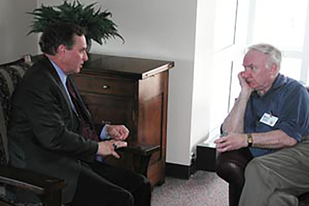 Robert Bowman, department head of electrical engineering, left, chats with Barrie Gilbert on May 5 in The Gilbert Study. The study is named after the renowned circuit designer, who visited RIT for the dedication of the Analog Devices Integrated Microsystems Laboratory. -