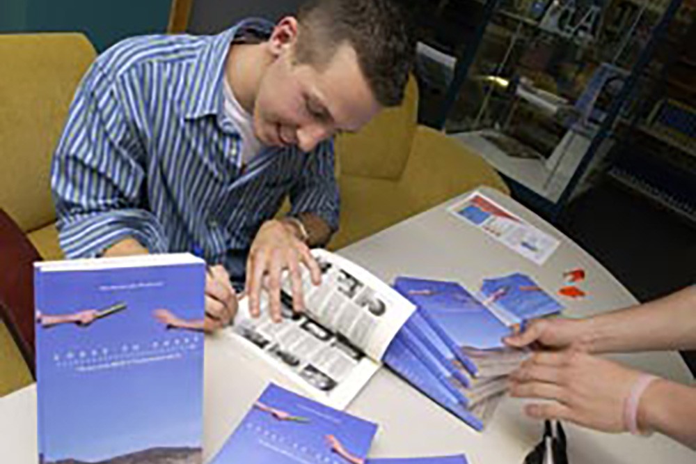 Ryan Pancoast, a 2005 RIT graduate (illustration), signs his new book Coast to Coast: The Story of the 2004 Transcontinental Relay Run. The RIT cross country team ran a 2,730-mile continuous relay from the Pacific Ocean to the coast of the Atlantic in less than two weeks in 2004. The book documents the run and is is available for $14.94 (soft cover) or $25.42 (hardcover) at lulu.com and RIT's Campus Connections bookstore. -
