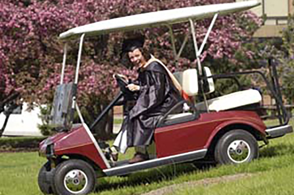 One of RIT's faithful commencement volunteers, Melissa Answeeney, dons cap and gown this year as she escorts visitors to and from campus venues. Prior to noon on Saturday, May 27, she will park her golf cart and prepare to walk the stage of Ritter Arena. Answeeney, a financial coordinator at RIT, is accepting her MBA at the College of Business ceremony. About 3,500 graduates are participating in commencement activities for RIT's eight colleges. -