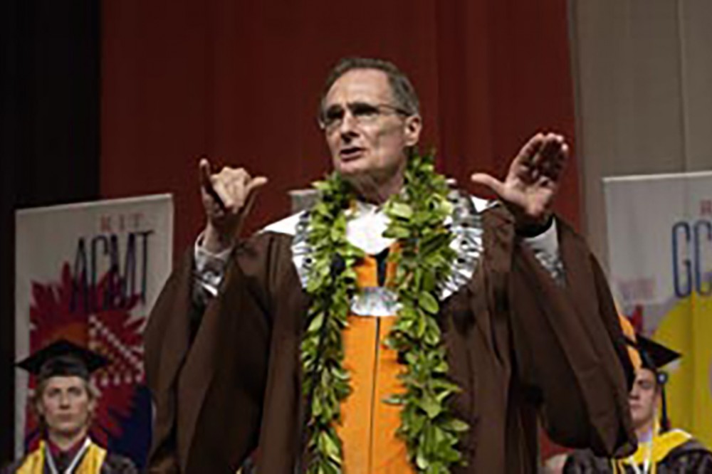 RIT President Albert Simone delivers his remarks in speech and American Sign Language at RIT's Academic Convocation on Friday, May 26. Convocation was part of the university's 121st Commencement. -