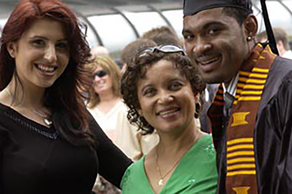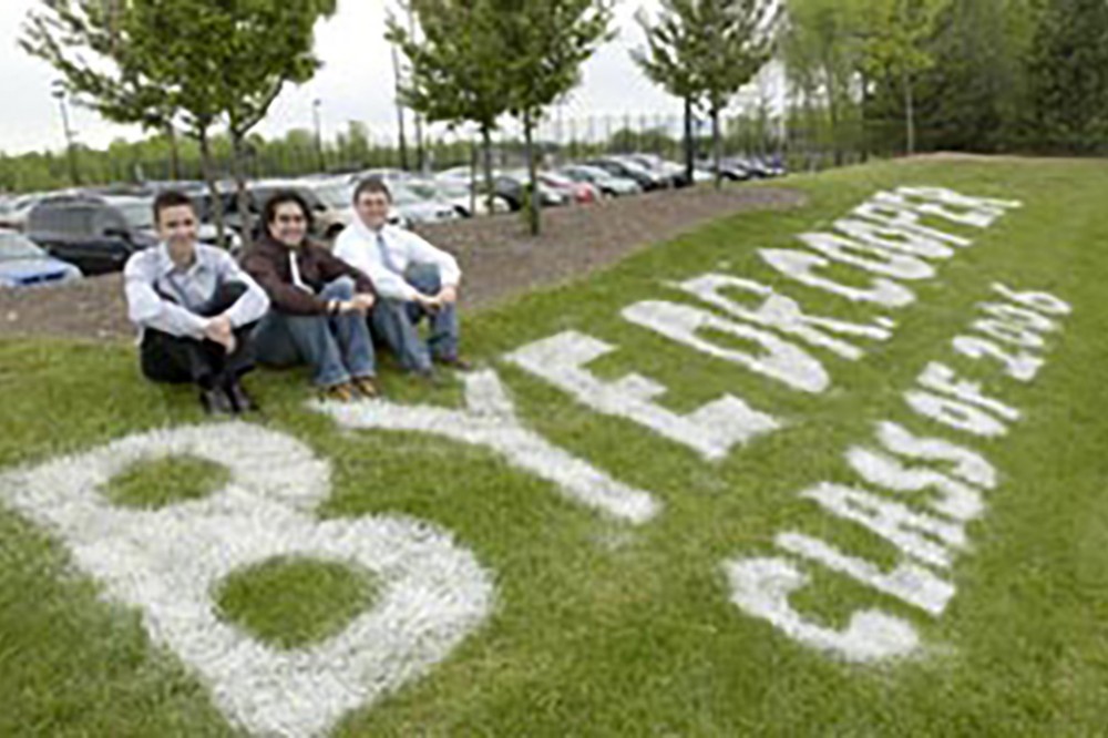 Graduating RIT students (from left) Cory Hoffman, James Macchiano and Greg Smith wanted to let Mary-Beth Cooper, vice president of Student Affairs, know how much she's appreciated. -