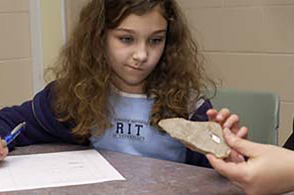 Rebecca Stade, 9, examines and identifies archaeological artifacts during RIT's Take Your Daughter or Son to Work Day on April 27. Rebecca is the daughter of Mary Beth Russo-Stade, who works with Hub Print/Postal Services. About 130 children took part in the day's activities, which included campus tours, lessons in film and animiation and toy design, and swimming.