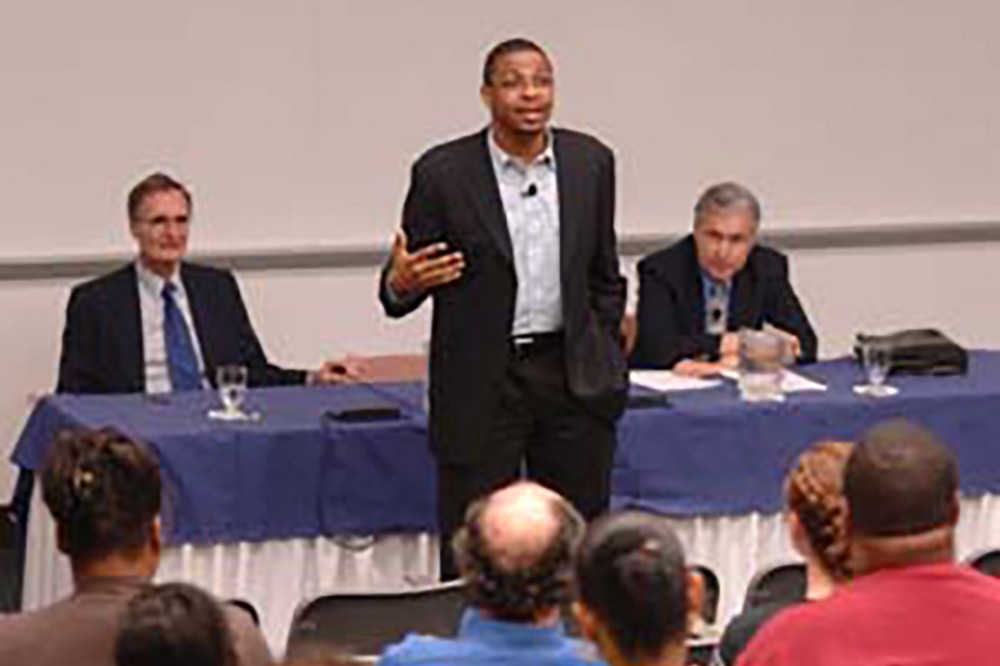 Roland Fryer Jr., assistant professor of economics at Harvard University, discussed race and inequality during RIT's Presidential Colloquium on May 1. The lecture, "Towards a Unified Theory of Black America: The Racial Achievement Gap and What to do About It," described economic reasoning to dispel misconceptions in the affirmative action debate. Fryer's appearance coincided with RIT's annual Expression of Diversity Conference. -