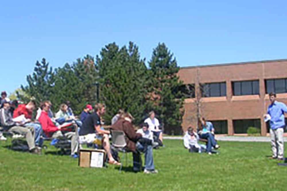 Engineering professor Steven Day takes the classroom outside so his students can enjoy the spring weather while learning about fluid mechanics. -