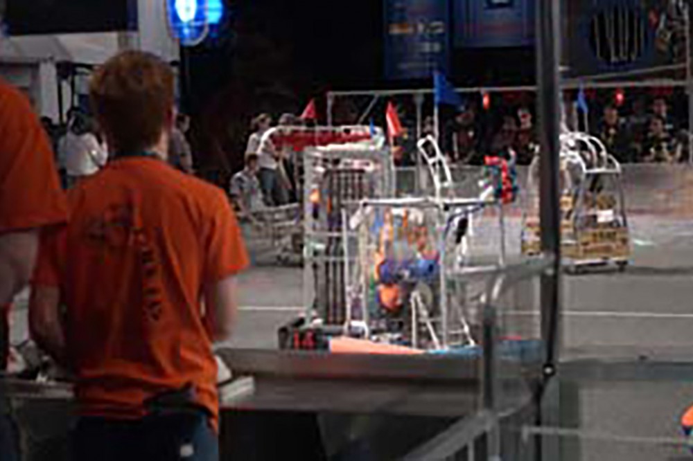 Team T-Rx, representing high schools in Norwich, Sherburne and New Berlin, N.Y., compete in the FIRST Robotics Competition at RIT. The regional event, March 9-11, pits 30 student teams from the Northeast U.S. and Canada in a challenging, sports-style contest. Participants are vying for the opportunity to compete in next month's national competition in Atlanta. -