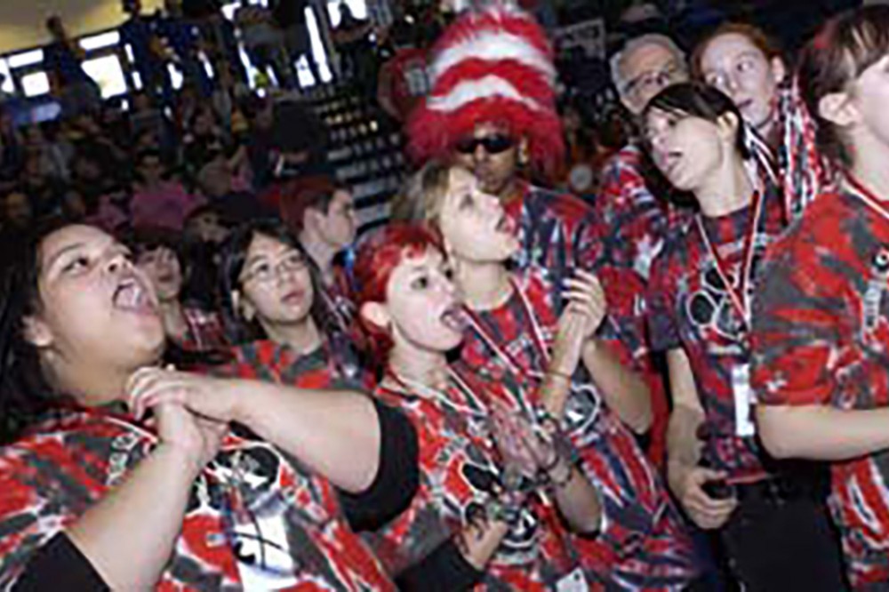 Students from Joseph C. Wilson Magnet High School in Rochester cheer on their team at the FIRST Robotics Competition, held at RIT March 9-11. The Wilson Magnet squad, named the X-Cats, was among 30 teams from the Northeast U.S. and Canada who took part in the sports-style contest. The event offered participants an opportunity to vie for a slot at next month's national competition in Atlanta. -