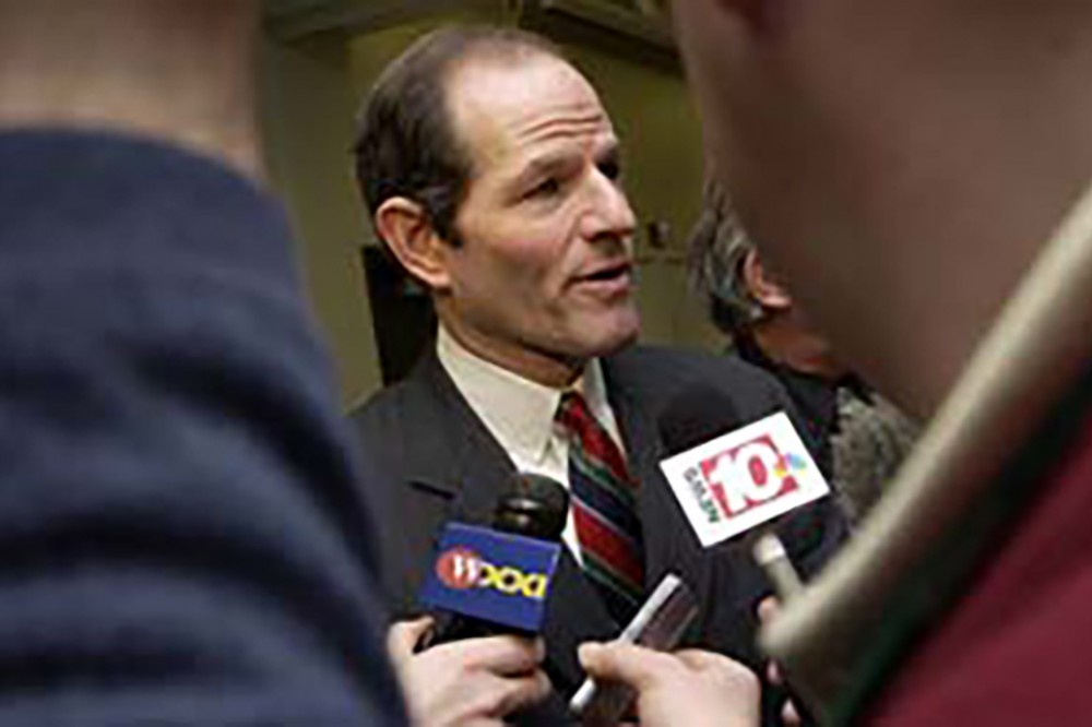 Eliot Spitzer, New York attorney general, speaks with local media during a visit to RIT's Center for Integrated Manufacturing Studies on March 2. Spitzer, a democrat who is running for governor, delivered his first major economic development address to local business and government leaders, focusing plans to revitalize the upstate New York economy. He noted that an emphasis on innovation and entrepreneurship offers the best opportunity for improving the economic landscape, and he commended President Albert Simone for his vision and leadership of RIT. -