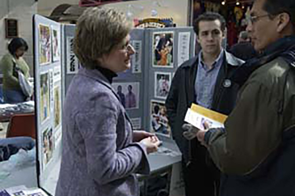 Helen Gormont, coordinator of volunteers with Big Brothers Big Sisters of Greater Rochester, describes opportunities with the agency as part of RIT's Community Service Fair on March 15. Representatives from 20 organizations met with students, faculty and staff to share information on services provided and ways in which people can volunteer. Big Brothers Big Sisters recently initiated a campus-based program at RIT, providing student mentors an opportunity to interact with "little brothers and sisters." -