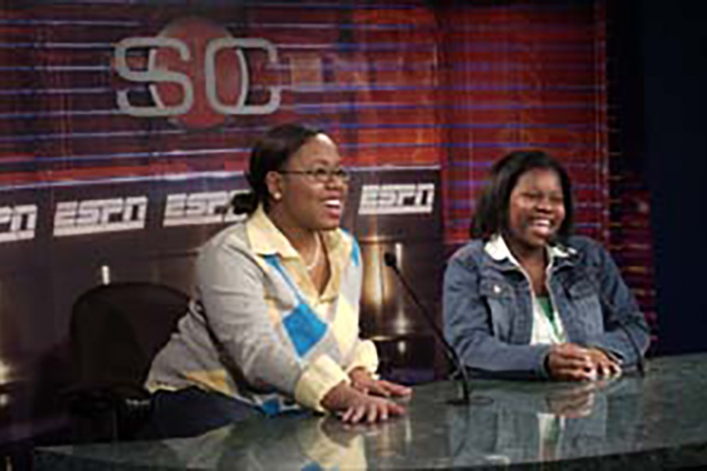 RIT student Kelly Brown, left, shares a laugh with âlittle sisterâ Tiffany as they try their hand at the ESPN Interactive Experience in the RITz Sports Zone. Brown is among five pioneering RIT students initiating a program sponsored by Big Brothers Big Sisters of Greater Rochester. The effortâmatching âlittle brothers and sistersâ with RIT student mentorsâis intended to provide each pair with the opportunity for one-on-one interaction during twice monthly gatherings on campus. -