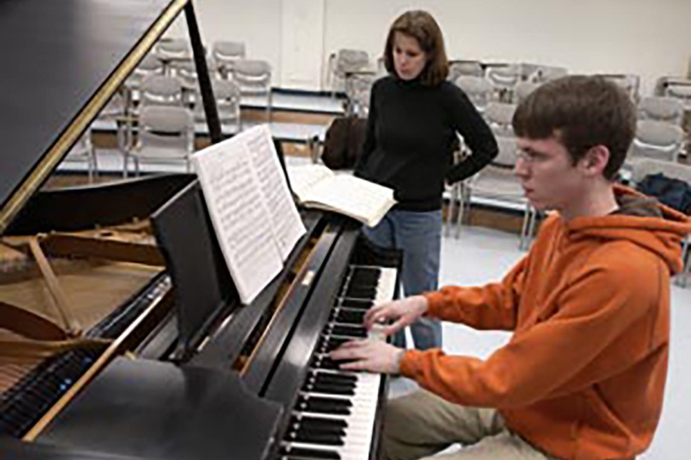 Piano instructor Julie Ruhling gives Ben Hughes, second-year information technology major, a private lesson on the music program's newly rebuilt Steinway. The piano will feature prominently in the upcoming "All Mozart" recital celebrating the 250th anniversary or Mozart's birth. The free concert will take place at 1 p.m. Friday, March 31, in the Student Alumni Union Music Room, A120. -
