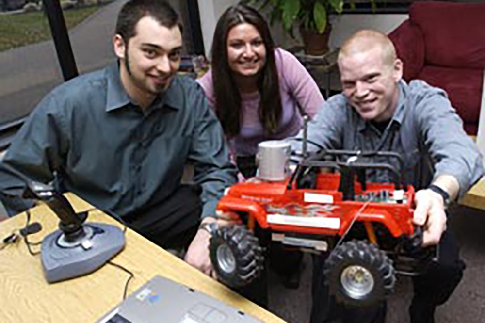 Among the computer-controlled senior design projects demonstrated by RIT computer engineering majors on Feb. 16 was a remote-controlled surveillance vehicle, shown above held by William Burgdorf, a fifth-year student. With him are project teammates Tom Fisher and Eleni Binopolus-Rumayor, also fifth-year students. The battery-operated truck is controlled via an Internet connection. -