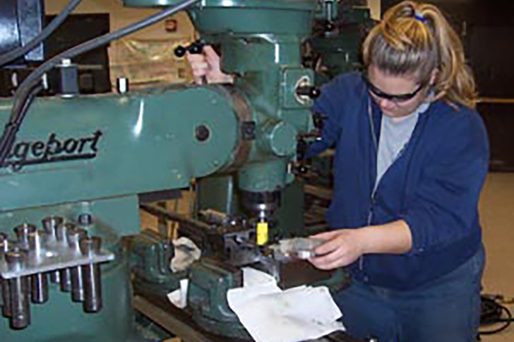 Rachel Belter, a first-year mechanical engineering technology major and member of the RIT Formula SAE Racing Team, cuts chassis tubes for this yearâs racecar. Belter is one of four females on this yearâs teamâan all-time high for the group. The team is preparing for its first race of the season, this May, in Pontiac, Mich. -