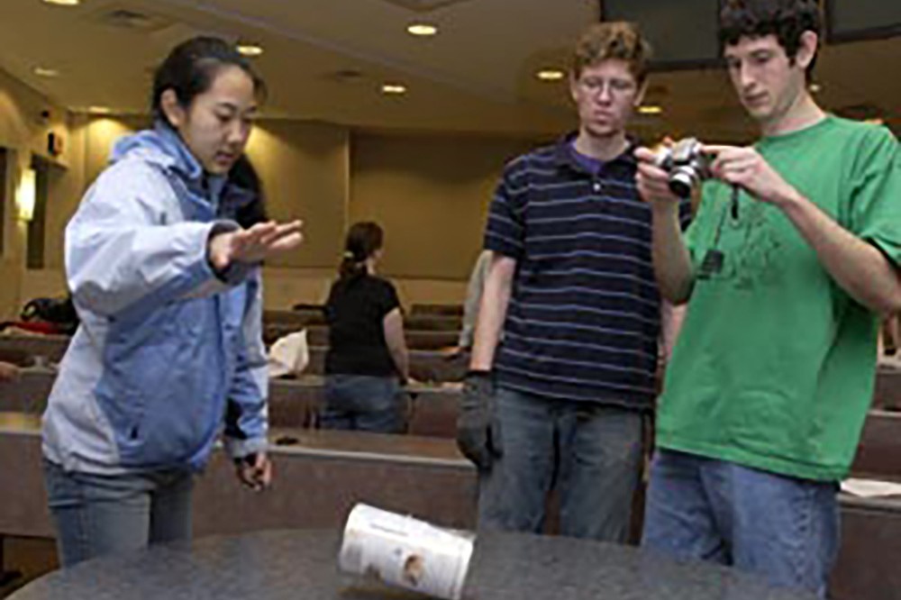 A group of 30 first-year engineering honors students recently participated in decidedly âlow-techâ competition. The object of the first âTip-a-Canâ event was to design a device, housed within a closed cylindrical container, that would automatically tip the can as close as possible to 60 seconds after the start of a timer. Eight teams of studentsâincluding, from left, Eva Ames, Jimmy LaPointe and Thom Siegwartâcreated improvised contraptions using such everyday, inexpensive items as egg timers, duct tape and mouse traps. -