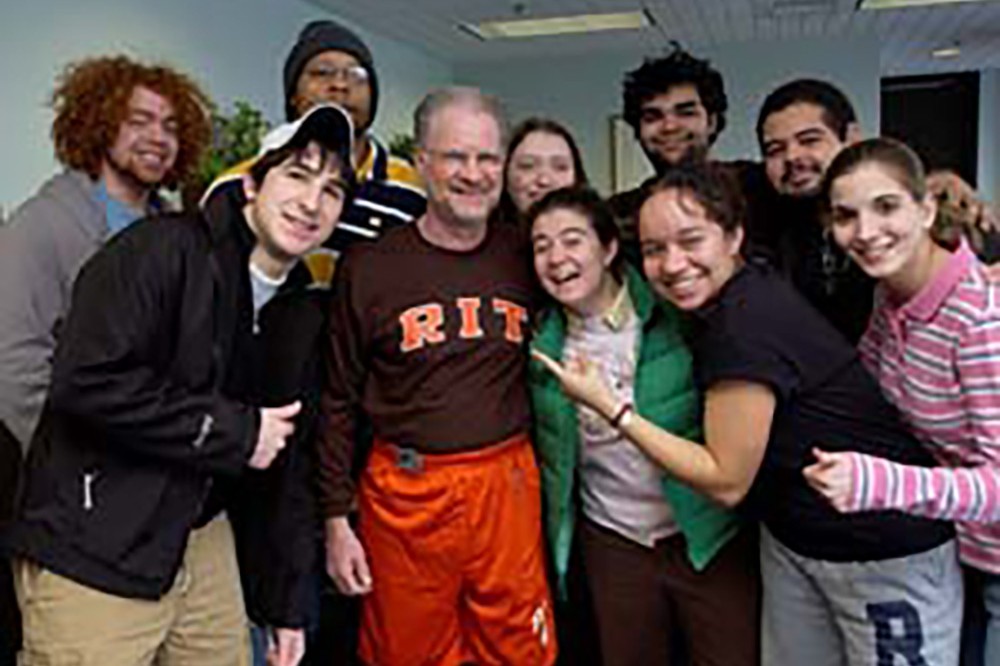 T. Alan Hurwitz, dean of the National Technical Institute for the Deaf, shows his RIT spirit and jokes with students while he makes good on his promise to dress for a day in RIT colors, one result of a recent NTID fundraising auction to benefit students with financial need. Some 35 items were auctioned, raising more than $4,000. -