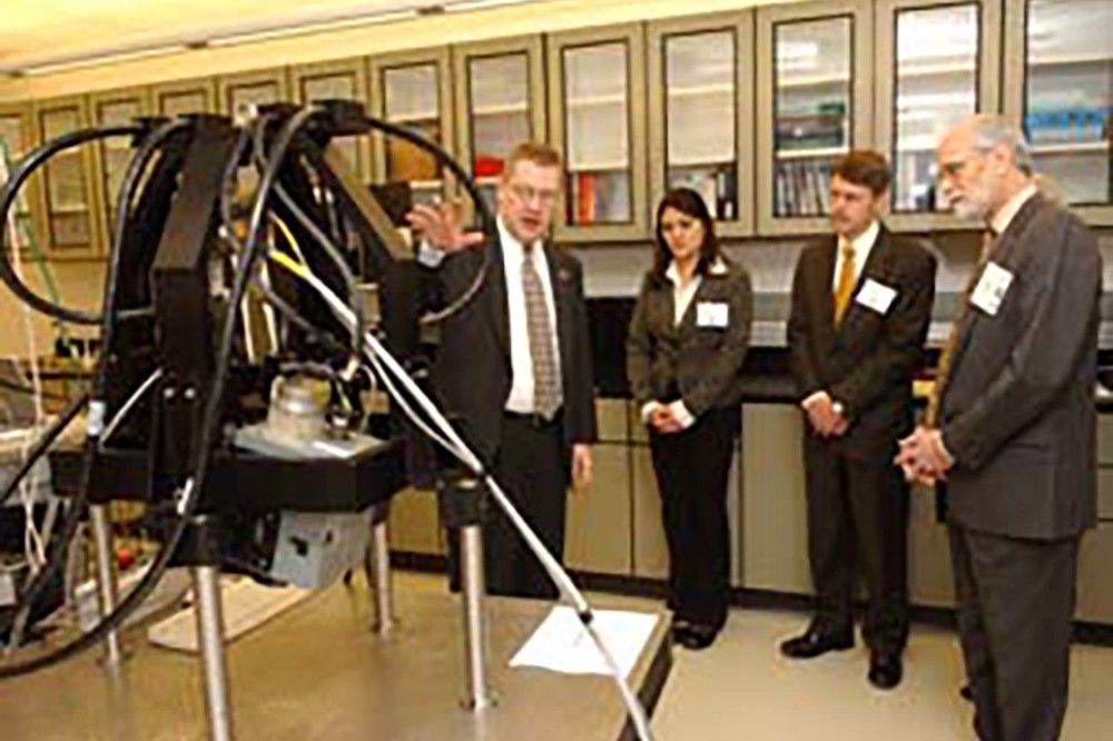 Representatives from the Department of Homeland Security tour the labs within RIT's new IT Collaboratory facility. Don McKeown, left, distinguished researcher in RIT's Chester F. Carlson Center for Imaging Science, was among the presenters. Also pictured, from left to right, are Chris Ann Nguyen, Office of Legislative Liaison, Dept. of Homeland Security; Robert Hooks, deputy director of Office of Research and Development, Science & Technology, Dept. of Homeland Security; and Don Boyd, RIT's vice president for research. The IT Collaboratory, a NYSTAR research center, will be formally dedicated on March 3. -