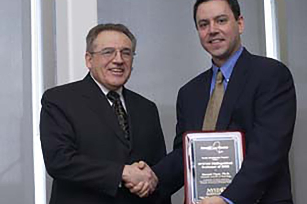Russell Bessette, left, executive director of the New York State Office of Science, Technology and Academic Research, presents a faculty development award to RIT astronomer Don Figer during a ceremony on campus Feb. 8. Figer recently joined RIT as a result of NYSTAR's $750,000 grant, highlighting the agency's commitment to assiting universities develop new areas of expertise leading to economic development. -