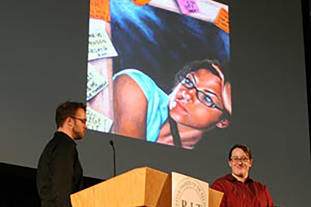 Todd Stahl, an art teacher at Webster Thomas High School, introduces one of his student's award-winning pieces during the Scholastic Art Awards 2006 ceremony at RIT on March 5. -