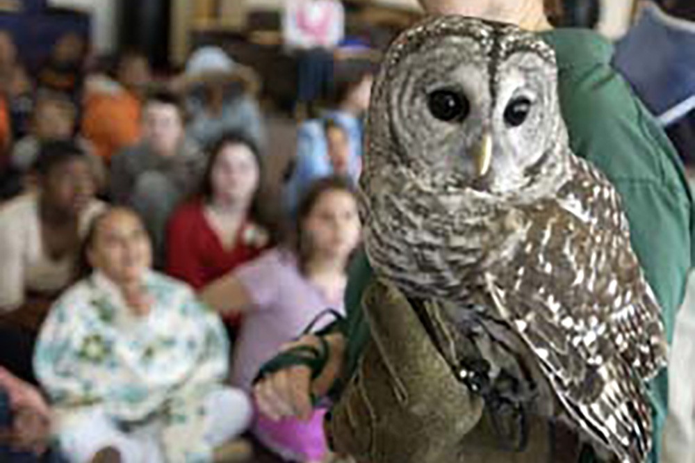 An owl fascinates over 100 children from Rochester city schools during a Wegmans ZooMobile presentation on RIT's Love Day. RIT student clubs hosted activities on Feb. 14 that included science experiments, learning sign language, computer design, face painting, cookie baking, and arts and crafts. -