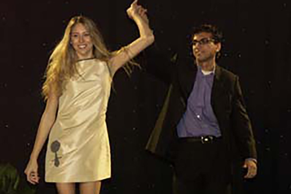Bhavin Parekh, material science and engineering student in RIT's College of Science, poses with model Laine Blumenkopf at the Materials Research Society fashion show in Boston last month. Parekh and fellow student Naveen Rawat represented RIT at the event highlighting technologies potential impact on future apparel. Students from Carnegie Mellon University and MIT were among the other participants. The small logo on Blumenkopfâs dress can change color depending on body temperature. -