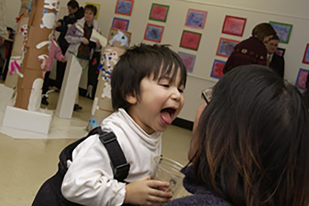 Gabriel McMurtrie shares a silly moment with mom, Elouise Oyzon, at the Margaretâs House art show opening, Dec. 15. For 10 weeks, 23 preschoolers from Margaretâs House and 16 pre-service art educators from the School of Art worked hard to produce unique and exciting art for the show. -