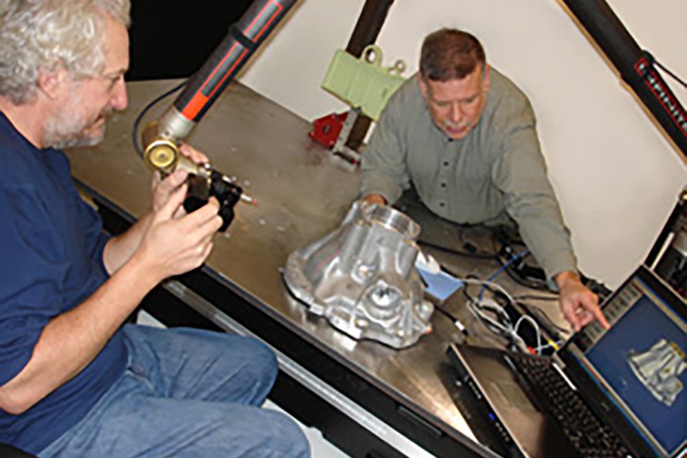 Professor Raymond Grosshans, left, and Michael Haselkorn use laser imaging equipment to create a digital schematic of an aircraft part. -