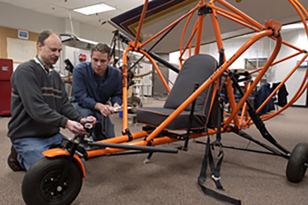 Kevin Kochersberger, associate professor of mechanical engineering (left), and John Chambers, a fifth-year mechanical engineering B.S./M.S. student and lab assistant, inspect a powered-parachute airframe. Kochersberger instructs the only light-sport aircraft/powered-parachute inspection course in the nation. -