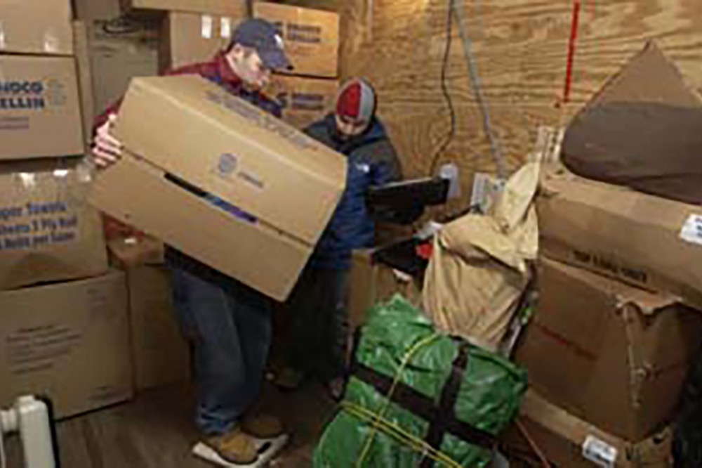 RIT students (left to right) A.J. Siegel and Evan Sax weigh boxes of clothes and camping equipment headed to Pakistan. Following Octoberâs deadly earthquake in Pakistan, RIT faculty and students started an online campaign, www.QuakeHelp.net, urging people to donate camping equipment. Since November, more than two tons of gear was collected in Rochester. UPS is shipping the supplies free of charge. -