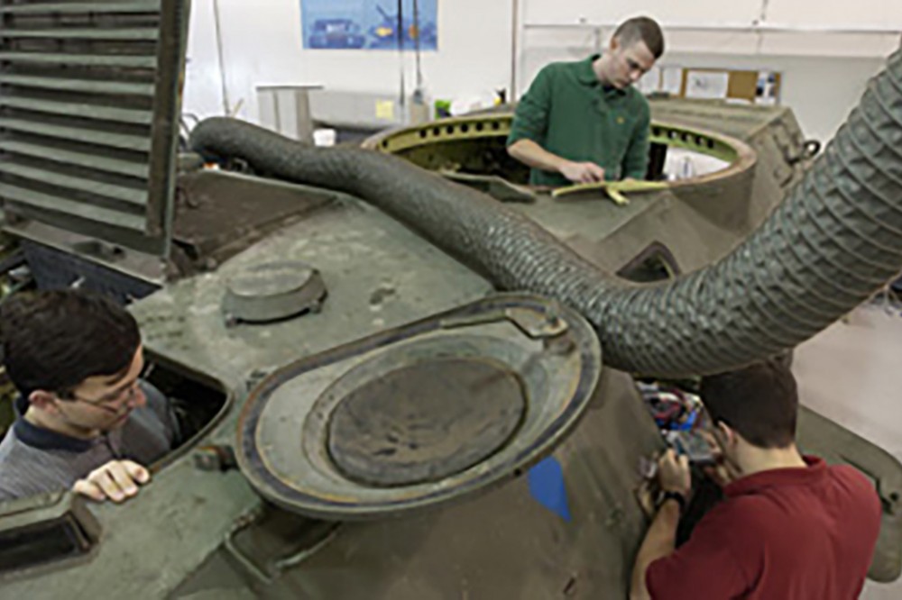 CIMS co-op students, clockwise from top, James Bagg, Matthew Chabot and Jonathon Pickard work on a Marine Corps Light Armored Vehicle in preparation for its use in CIMSâ research program. A network of sensors will be integrated into the vehicle to monitor key equipment, allowing for real-time diagnostic and prognostic health assessment to reduce logistics costs by making re-supply, maintenance and repair efforts more effective while also enhancing the safety of military personnel in the field. -