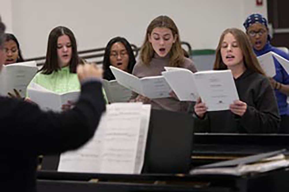 The RIT Singers rehearse for a community concert at RIT. Directed by Ed Schell, music program director in RITâs College of Liberal Arts, The RIT Singers, along with a string quartet, clarinetist, flutist and percussionist, premiered an original piece of music commissioned for RITâs 175th anniversary at a community concert earlier this month.