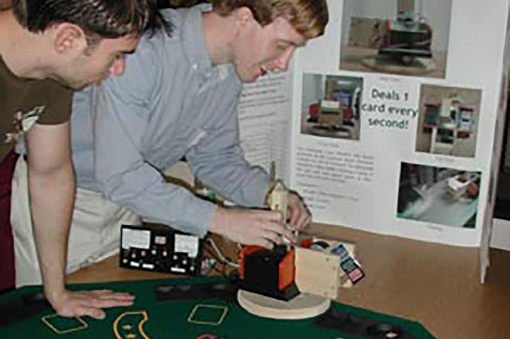 An automated playing-card shuffler/dealer was among computer-controlled senior-design inventions demonstrated by computer engineering majors Nov. 10 in Erdle Commons in the James E. Gleason Building. Justin Madigan, left, and Matt Erhard, along with Brian Cody (not shown in photo), fifth-year B.S./M.S. computer engineering majors, built the device for less than $100. It includes settings for the number of players and the number of cards per player. Other projects demonstrated include an automated driverâs license test monitoring system and an automated pool maintenance system, among others. -