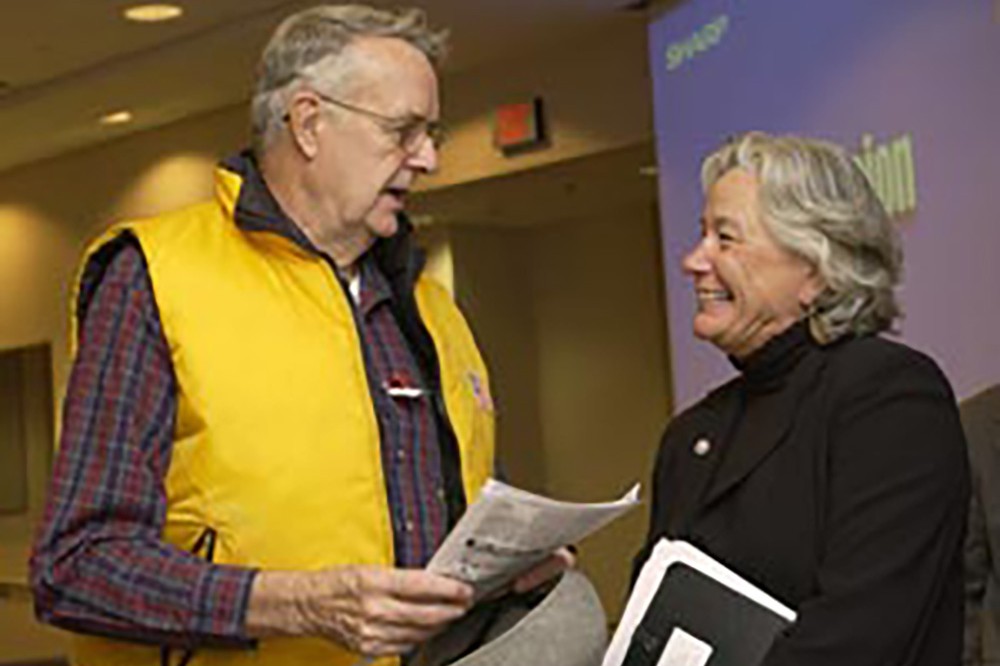 Irene Brooks, commissioner of the International Joint Commission, chats with James Quick, of Wolcott, who came to RIT Nov. 10 for a discussion on the future of the Great Lakes. In her talk, âThe Great Lakes: The Challenge Is Yours,â Brooks discussed the Great Lakes Water Quality Agreement, the regulation of Lake Ontario outflows and levels, and the International Joint Commission watershed initiative. The commission is an independent advisor to the United States and Canada on boundary and transboundary issues. Brooks visit was sponsored by the mechanical engineering department in RITâs Kate Gleason College of Engineering. -