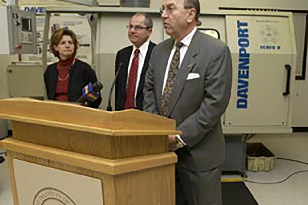 Chairperson Jackie Mozrall of industrial and systems engineering, Nabil Nasr, Earl W. Brinkman Professor of Engineering and director of the Center for Integrated Manufacturing Studies, and Robert Brinkman, CEO of Brinkman Int. Group and Davenport Machine, announce the collaboration of the Kate Gleason College of Engineering and Davenport Machine. Davenport has donated equipment worth over $200,000 for use in research and development at RIT's Brinkman Lab. -
