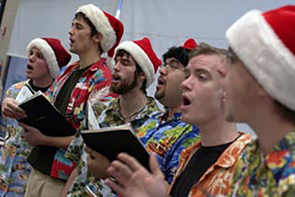 RIT's Brick City Singers perform a cappella holiday tunes at a tree decorating party in Fireside Lounge, Student Alumni Union, on Dec. 1. Students, faculty and staff sipped hot cocoa and cider and nibbled on candy floss, popcorn and cookies as they decorated ornaments for the tree. The event was sponsored by the Center for Campus Life. -