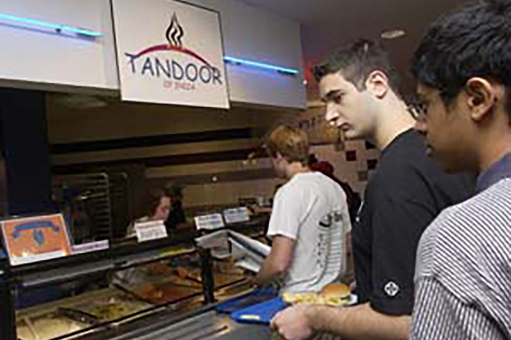 Students line up to enjoy a taste of India as part of the new dining options now available at Gracie's dining facility in Grace Watson Residence Hall. Tandoor Restaurant, located in Henrietta, offered a menu featuring tamarind rice, basmati rice, Manchurian chili chicken, dum aloo, coconut chutney, Indian nan bread. Other local establishments featured regularly at Gracie's include Yang's Asian, Thali of India, Fox's Deli, Sal's Birdland and The Empanada Shop. -