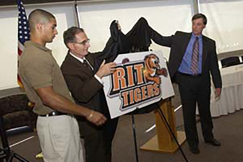 RIT hockey captain Marc Hyman, left, joins President Albert Simone and Coach Wayne Wilson to unveil the new RIT athletic logo. The design was introduced on Sept. 27 during Media Day activities for the inaugural Division I season of RIT men's ice hockey. Reporters got a chance to speak with members of the team in advance of the season opener on Oct. 14. The new logo becomes the official image of RIT's 24 varsity sports. -