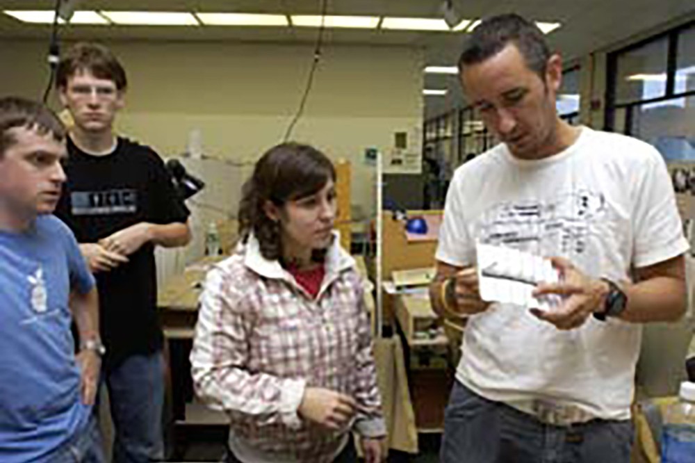 Industrial design alumnus Scott Wilson '91 (far right) returned to RIT on Sept. 16 to meet with industrial design students including, from left to right, Bryan Hammer, Andrew Warnick, and Lisa Aronson. Wilson, the Global Creative Director at Nike Inc.âs Explore group, is looking at a model of a strap for a laptop bag designed by fourth-year ID major Jeff Smith. Wilsonâs lecture was organized by RITâs student chapter of the Industrial Designers Society of America. -