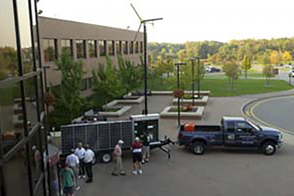 A portable hybrid power plant greeted visitors to the RENEW NY open house, hosted by RIT on Oct. 4. Northeast Renewable Energy Resources, based in Bloomfield, N.Y., used the event to showcase the system, which features a wind turbine and solar panels. The company was among dozens of exhibitors to take part in the open house. RENEW NY (Renewable Energy Network of Entrepreneurs in Western New York) launched last year to support area start-up firms in the commercialization of renewable energy technologies. -