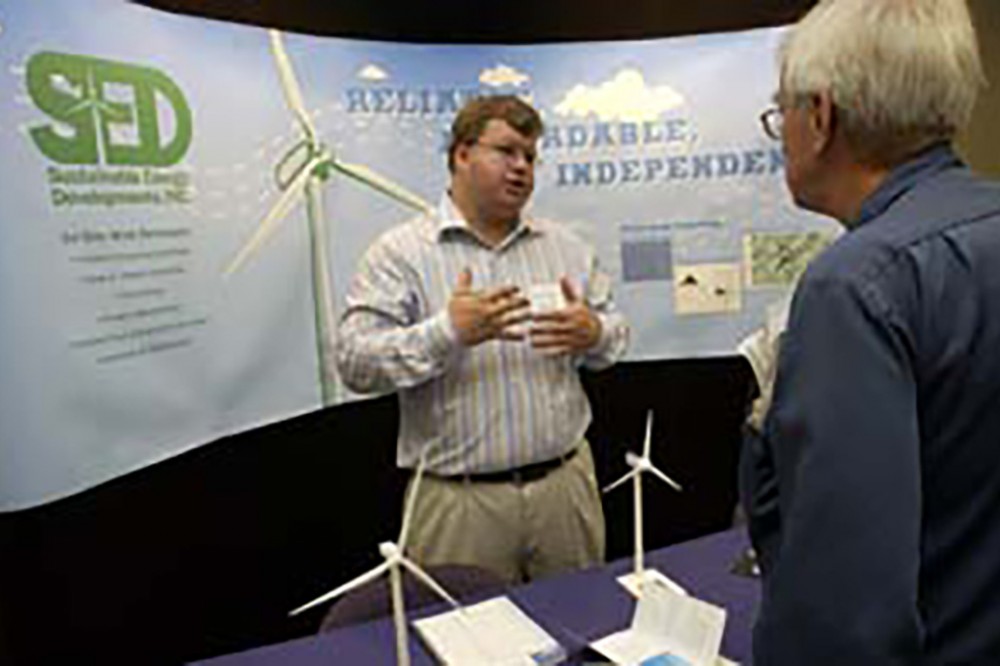 Kevin Schulte, vice president of Sustainable Energy Developments Inc., touts the value of wind energy at the RENEW NY open house, hosted by RIT on Oct. 4. The company works with municipalities and various other organizations in distributing wind projects. Dozens of other exhibitors took part in the open house. RENEW NY (Renewable Energy Network of Entrepreneurs in Western New York) launched last year to support area start-up firms in the commercialization of renewable energy technologies. -