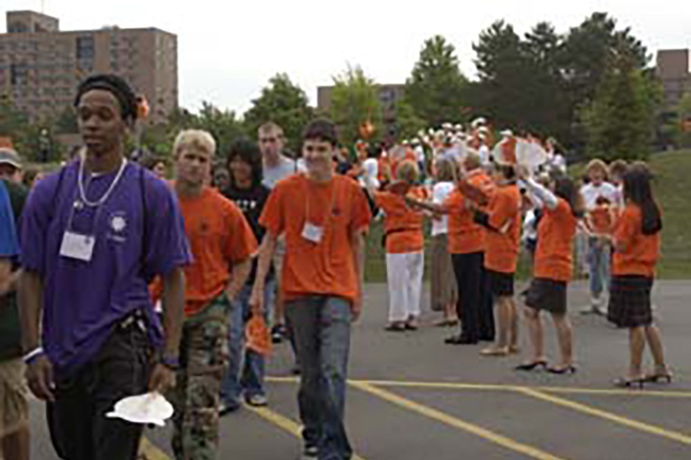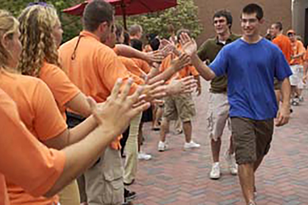 Members of the New Student Orientation team congratulate first-year RIT students now prepared to kick off their college careers. The orientation assistants, more than 100 upperclassmen often clad in orange t-shirts, played a major role in acquainting the newcomers to campus during RIT's weeklong introductory program. Class begin Monday, Sept. 5. -