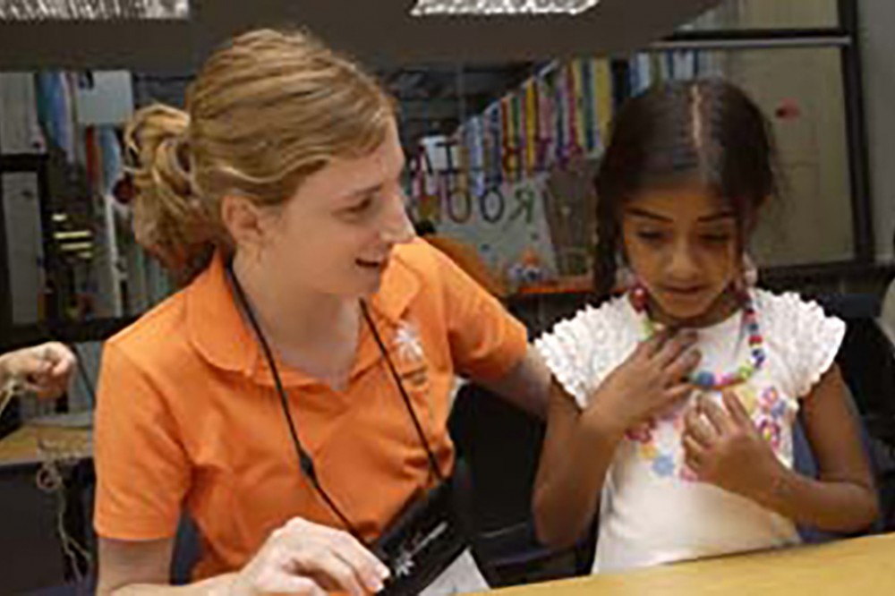 Tina Stoudt, fourth-year management information systems (MIS) student in RIT's College of Business, shares an activity with Melisssa Uditnarain, 6, in the Sibling Breakroom. The pair collaborated to make a necklace while Melissa's big brother, Junior, and her parents took part in New Student Orientation events. Stoudt is among more than 100 RIT upperclassmen serving as this year's orientation assistants. -