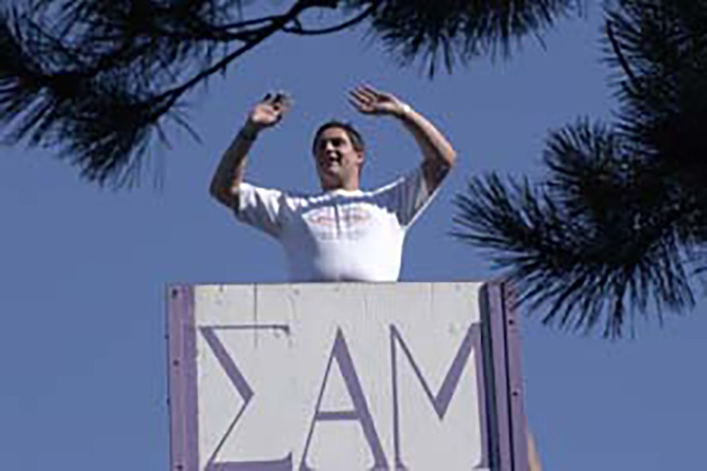 Alan Mikolajczuk greets fellow students from atop his perch during the 11th annual RIT Pole Sit. Members of Sigma Alpha Mu fraternity, who are taking turns at hanging out 40 feet above campus on a utility pole, are raising money for the Make-A-Wish Foundation. The four-day event runs through Friday, Sept. 9. -