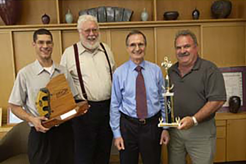 Anthony Capobianco, project manager for RIT's Formula SAE team, far left, and Alan Nye, professor of mechanical engineering and team advisor, far right, met recently with Provost Stanley McKenzie, second from left, and RIT President Albert Simone to present trophies the RIT team won at national and international Formula competitions during the 2004-2005 school year. -