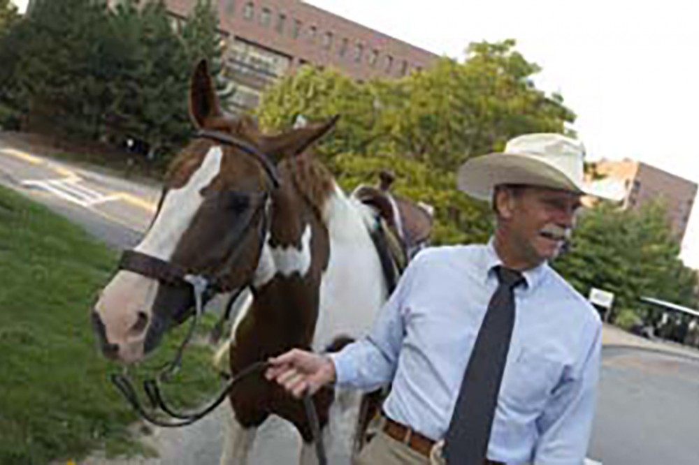 Howard Woolridge of Law Enforcement Against Prohibition speaks to students and faculty before his presentation at RIT on Sept. 12. Woolridge, a former police officer and longtime advocate for the legalization of drugs, is nearing completion of a 3,400âmile tour from Los Angeles to New York City, by horse, to raise awareness concerning proposed reforms of national drug control policies. RITâs department of criminal justice sponsored his speech. Woolridgeâs horse, Misty, is also pictured. -