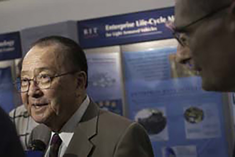 Sen. Daniel Inouye (D-Hawaii) spoke with local media during a tour of RIT's Center for Integrated Manufacturing Studies (CIMS). Inouye, the ranking member of the U.S. Senate Defense Appropriations Subcommittee, was joined by RIT President Albert Simone, right, for a demonstration of the Defene Modernization and Readiness Program. CIMS has received $21 million in Department of Defense funding over an eight-year period for related initiatives. -