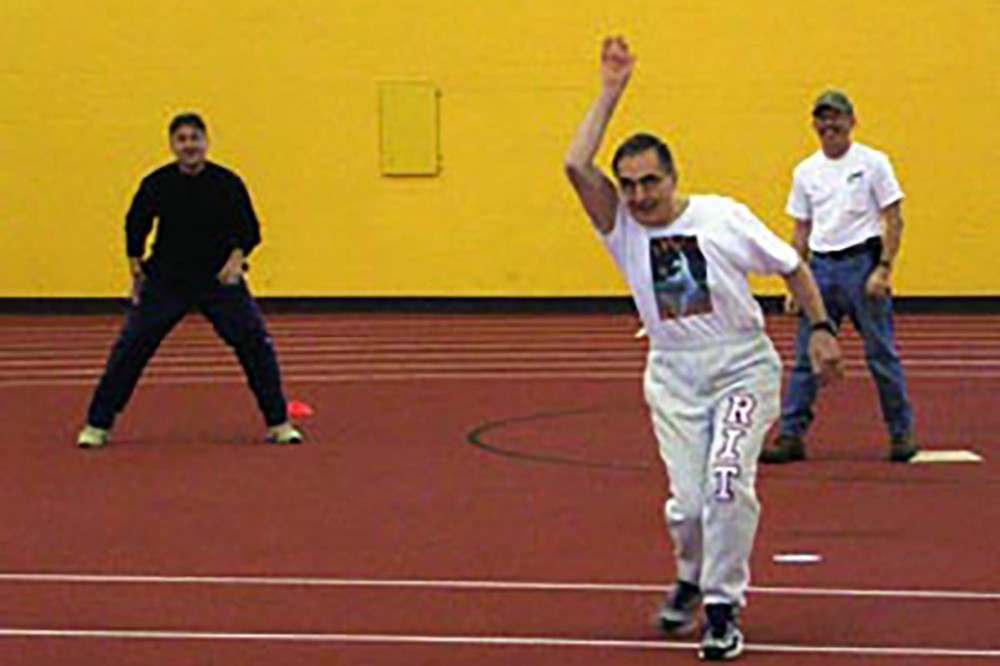 RIT President Albert Simone pitches a ball at the fifth annual President's Stickball Tournament held in the Gordon Field House and Activities Center, May 25. Sponsored by the president and Staff Council, RIT staff enjoyed food, music and camaraderie at the ninth annual Staff Appreciation Day & Community Picnic, also part of the day's events. -