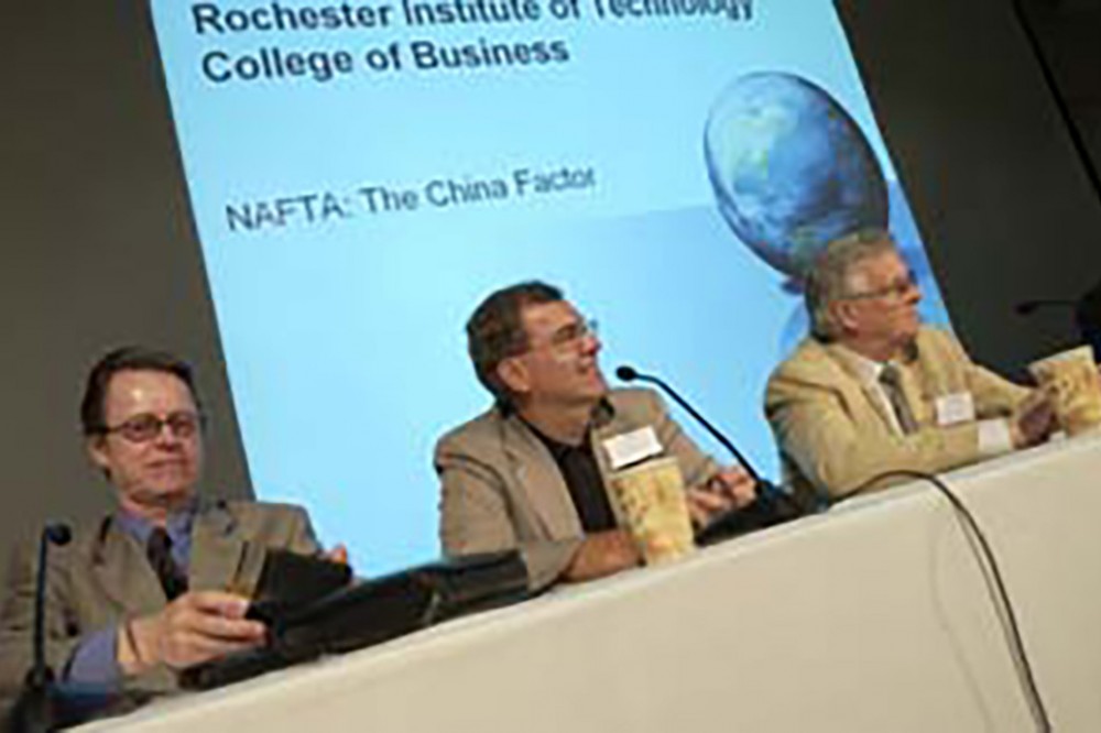 Panelists discuss "NAFTA: The China Factor" during a symposium sponsored by RIT's Center for International Business, May 26-27. David Reid, left, Benjamin Forman Chair of International Business in RIT's College of Business, moderated a session on the U.S. perspective of China's influence on the 10-year old trade agreement. The panel included Bruno Glavich, president and CEO of Applied Image Group, and Ron Jones, economics professor at University of Rochester. -
