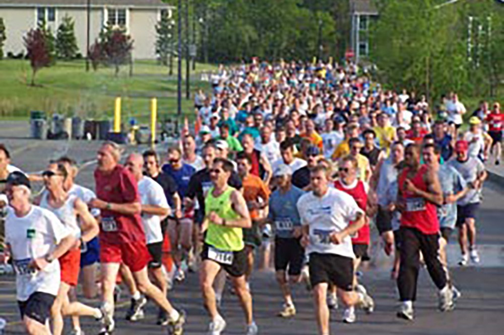 Runners enjoy a water break at the 1-mile mark of Rochester's 15th JP Morgan Chase Corporate Challenge held June 2 on the RIT campus. A total of 8,632 runners and walkers took on the 3.5-mile course around campus on a stellar sunny evening. -